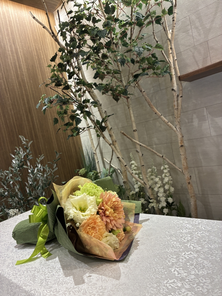お棺の上に飾らせていただいた緑色のラッピング花束がより、式場の雰囲気とマッチしています。