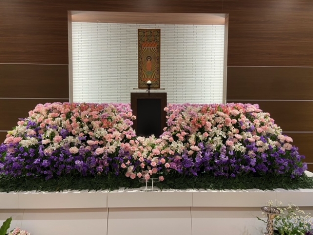 「お花が大好きで、いつも家の庭にもお花を植えてくれて・・・今はその存在の大きさに気づかされます・・・」と打ち合わせの時にお話しを伺いました。周囲に笑顔の花をたくさん咲かせてくれた故人様の祭壇はお花畑をイメージしました。