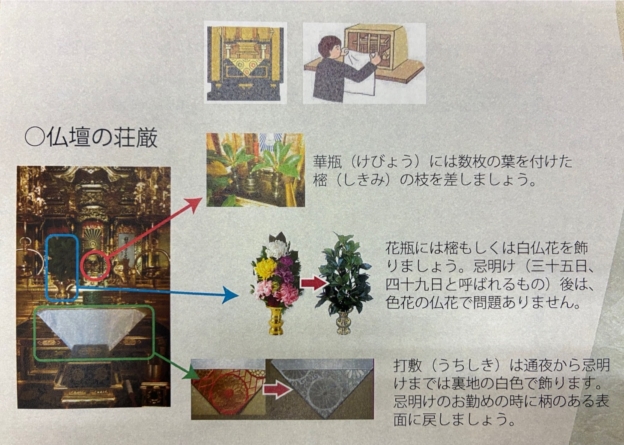 家族が亡くなった時には、白地の打敷を飾りますが、ない場合や用意出来ない時は、通常使っているものを裏返して白い面を表にして代用することもあります。