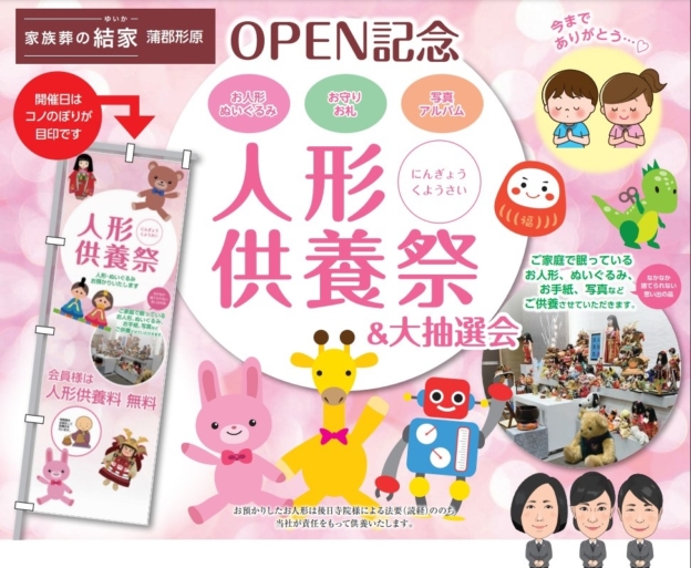 2022年7月に蒲郡市形原町に新規OPENいたしました家族葬専用会館「家族葬の結家 蒲郡形原」にて、人気イベント【人形供養祭】を開催いたします!