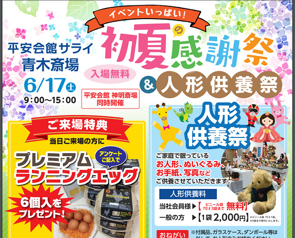 この度〈リニューアル大感謝祭&人形供養祭〉を【平安会館 サライ青木斎場】にて開催いたします。