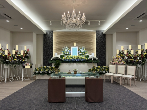 多くの方々の参列を想定し、式場は広々とした空間を保てるように式前焼香のお時間では椅子を一度撤去させていただきました。